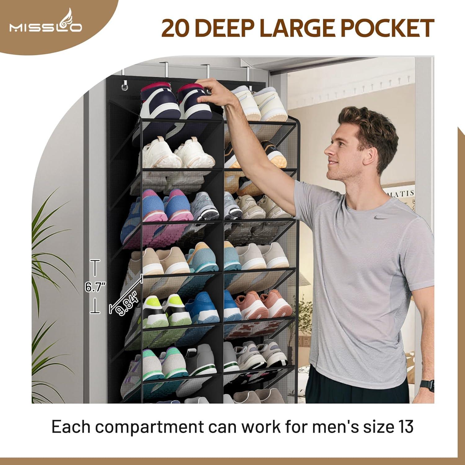 Tired of tripping over shoes by the door? Wasting precious morning minutes digging through a messy pile to find your favorite pair? Meet your secret weapon: the MISSLO 10-tier over the door shoe rack. This long over the door shoe caddy is a lifesaver! Stop searching and start stepping into an effortlessly organized life! Why You'll Love It: 【Huge Capacity】 This xl over the door shoe organizer is wider than most, so each tier comfortably holds 3 pairs of shoes. Stretching a full 71 inches tall, it harnesses every inch of the door’s height, magically storing 30 pairs total. If you stack on top of each other, you can fit more. 【Easy to Breathe】 The over the door shoe storage is made from breathable mesh and heavy-duty non-woven fabric that keeps air flowing. Plus, see everything at once! No more frantic searching in the morning—just grab and go. The sturdy tubes can hold heavy boots without bending. 【Holds All Shoes】 Worried about fit? Don't be. Our deep pockets in this big shoe hanger organizer for closet are designed for the whole family's footwear—from Dad's largest sneakers to Mom's tallest boots and everything in between—also as a kids shoe organizer. The slanted opening allows you to open/close the door easily without worrying about shoes falling out. 【Hangs Anywhere】 This behind door shoe organizer for entryway has 4 strong metal hooks that slide onto any standard door in your home—bedroom, closet, bathroom, dorm, or apartment. No tools, no hassle, just instant organization. 【Versatile Storage】 Beyond shoes, discover the wall mounted shoe storage for small spaces magic for organizing towels in the bathroom, accessories in the entryway, toys in the kids' room, or supplies in the laundry room. The door shoe organizer hanging is the versatile helper you’ll use everywhere. Stop letting clutter control your home. The shoe hanger for door is helping thousands of organized Americans to keep their home tidy and clutter-free! Click ‘Add to Cart’ now and turn your door into the most organized spot in your house!