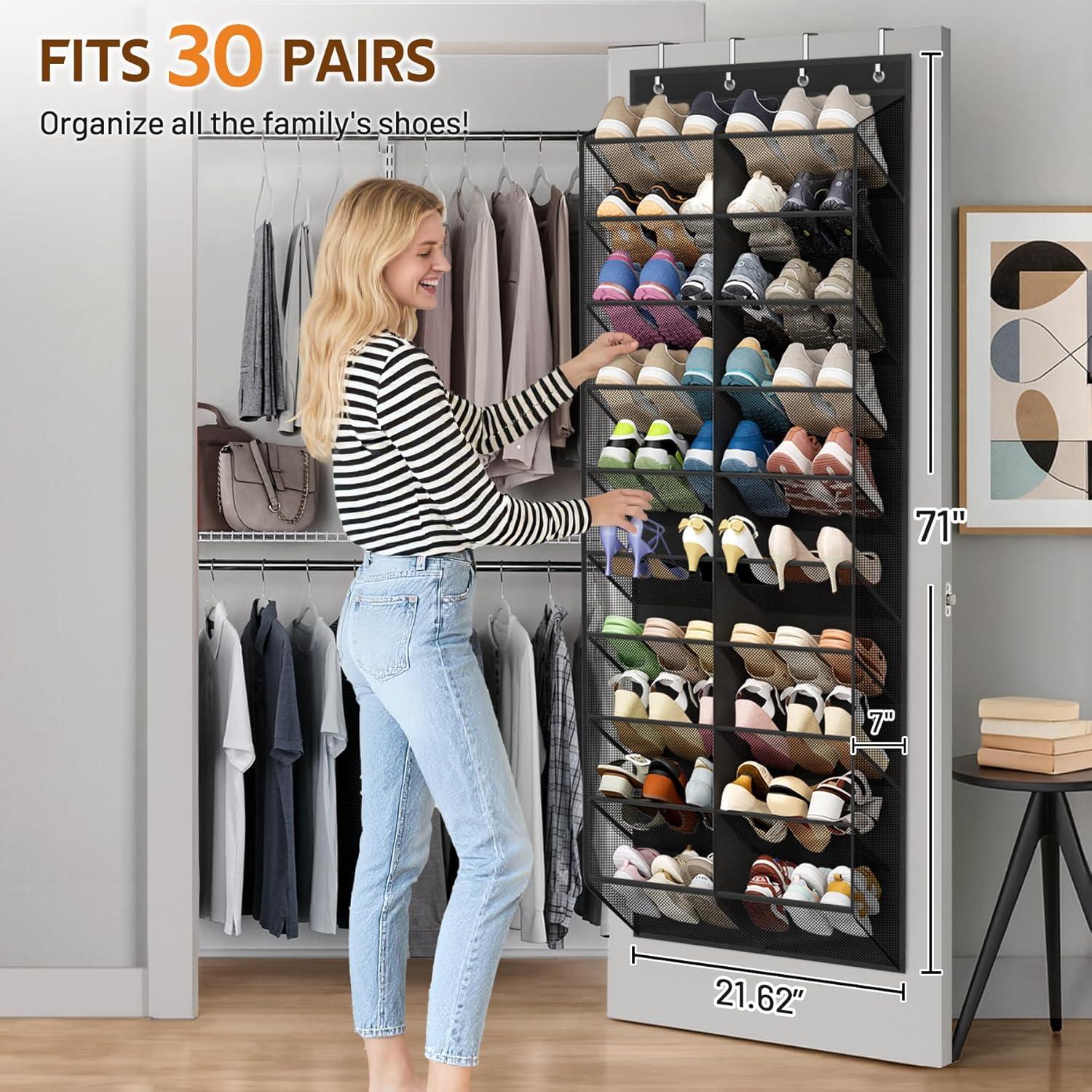 MISSLO 30 Pairs Over the Door Shoe Organizer Breathable Mesh Hanging Shoe Rack for Closet Storage with Wide Deep Pockets 10 Tier Shoes Holder Fit All the Family's Sneakers, Boots, Heels, Black(Black)