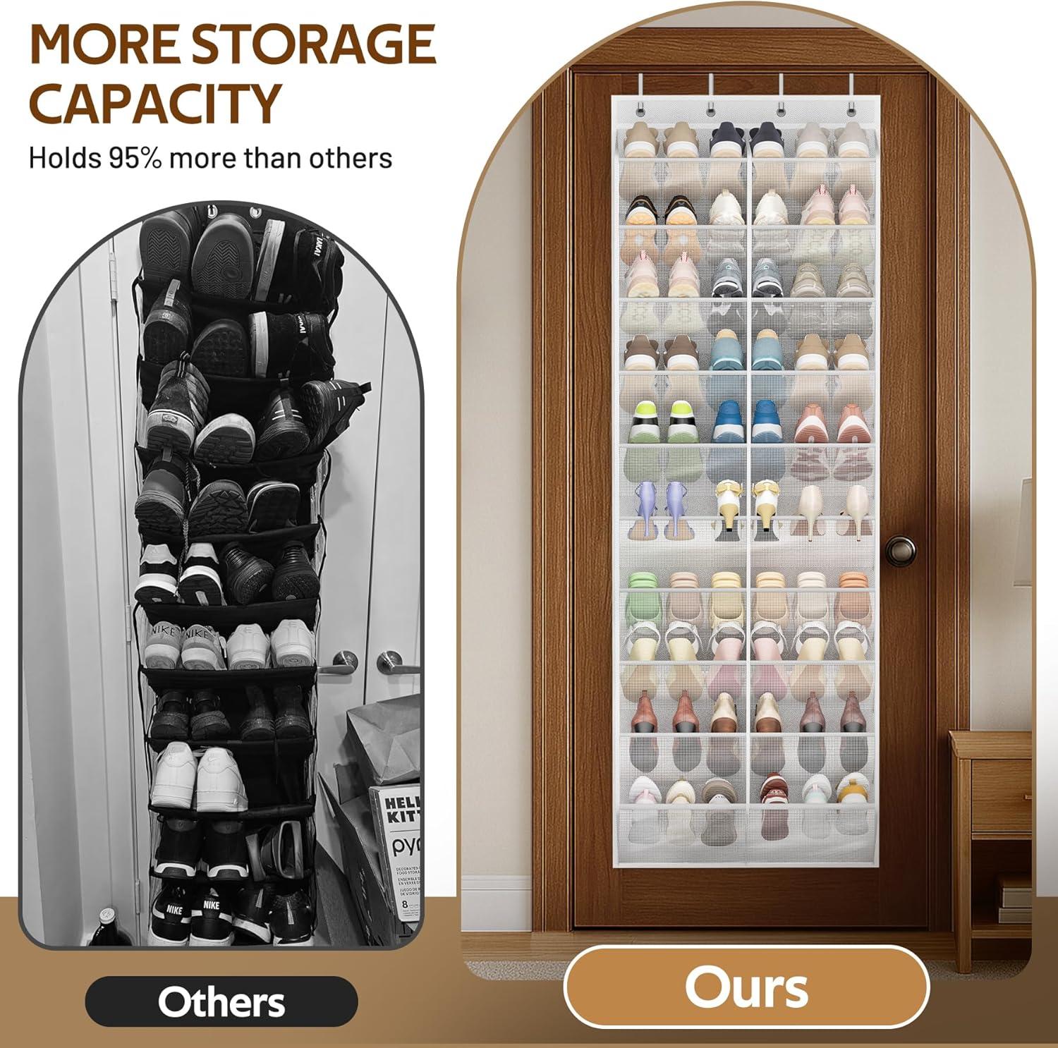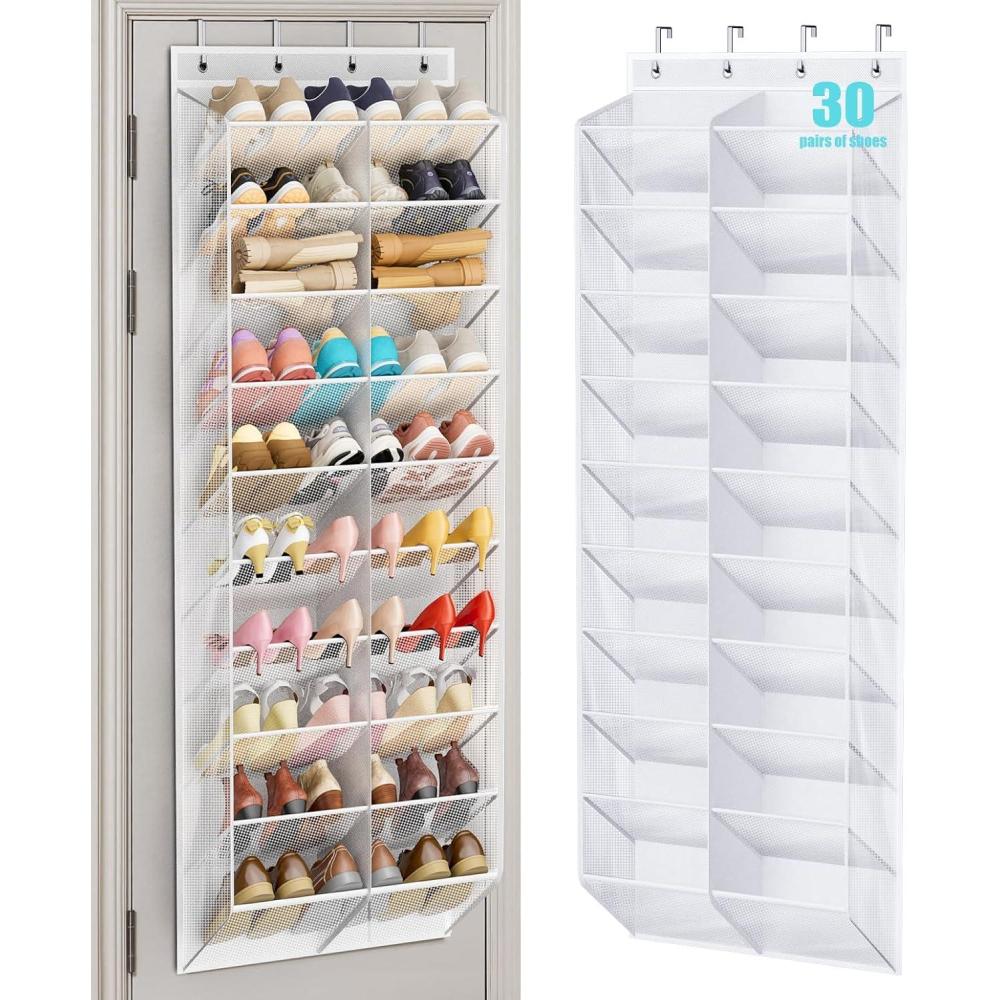 Tired of tripping over shoes by the door? Wasting precious morning minutes digging through a messy pile to find your favorite pair? Meet your secret weapon: the MISSLO 10-tier over the door shoe rack. This long over the door shoe caddy is a lifesaver! Stop searching and start stepping into an effortlessly organized life! Why You'll Love It: 【Huge Capacity】 This xl over the door shoe organizer is wider than most, so each tier comfortably holds 3 pairs of shoes. Stretching a full 71 inches tall, it harnesses every inch of the door’s height, magically storing 30 pairs total. If you stack on top of each other, you can fit more. 【Easy to Breathe】 The over the door shoe storage is made from breathable mesh and heavy-duty non-woven fabric that keeps air flowing. Plus, see everything at once! No more frantic searching in the morning—just grab and go. The sturdy tubes can hold heavy boots without bending. 【Holds All Shoes】 Worried about fit? Don't be. Our deep pockets in this big shoe hanger organizer for closet are designed for the whole family's footwear—from Dad's largest sneakers to Mom's tallest boots and everything in between—also as a kids shoe organizer. The slanted opening allows you to open/close the door easily without worrying about shoes falling out. 【Hangs Anywhere】 This behind door shoe organizer for entryway has 4 strong metal hooks that slide onto any standard door in your home—bedroom, closet, bathroom, dorm, or apartment. No tools, no hassle, just instant organization. 【Versatile Storage】 Beyond shoes, discover the wall mounted shoe storage for small spaces magic for organizing towels in the bathroom, accessories in the entryway, toys in the kids' room, or supplies in the laundry room. The door shoe organizer hanging is the versatile helper you’ll use everywhere. Stop letting clutter control your home. The shoe hanger for door is helping thousands of organized Americans to keep their home tidy and clutter-free! Click ‘Add to Cart’ now and turn your door into the most organized spot in your house!