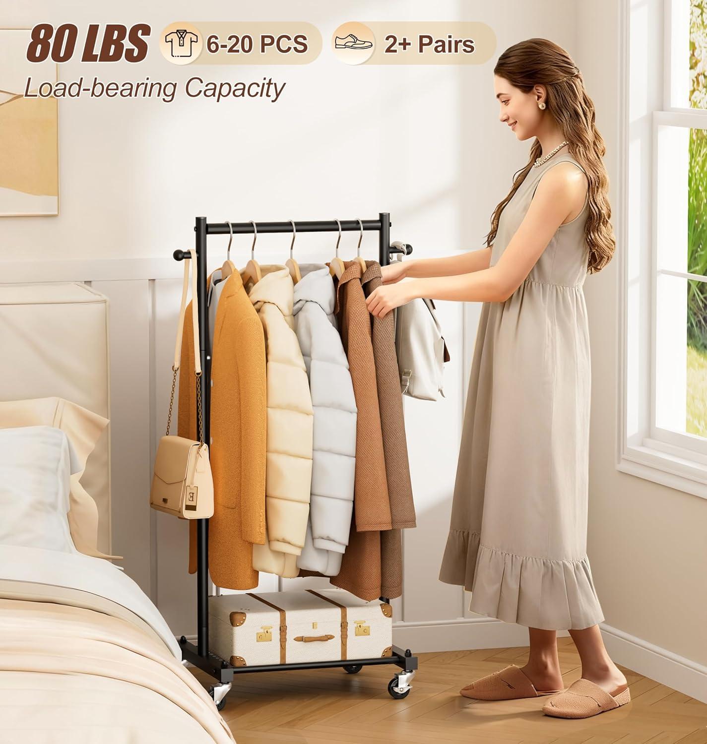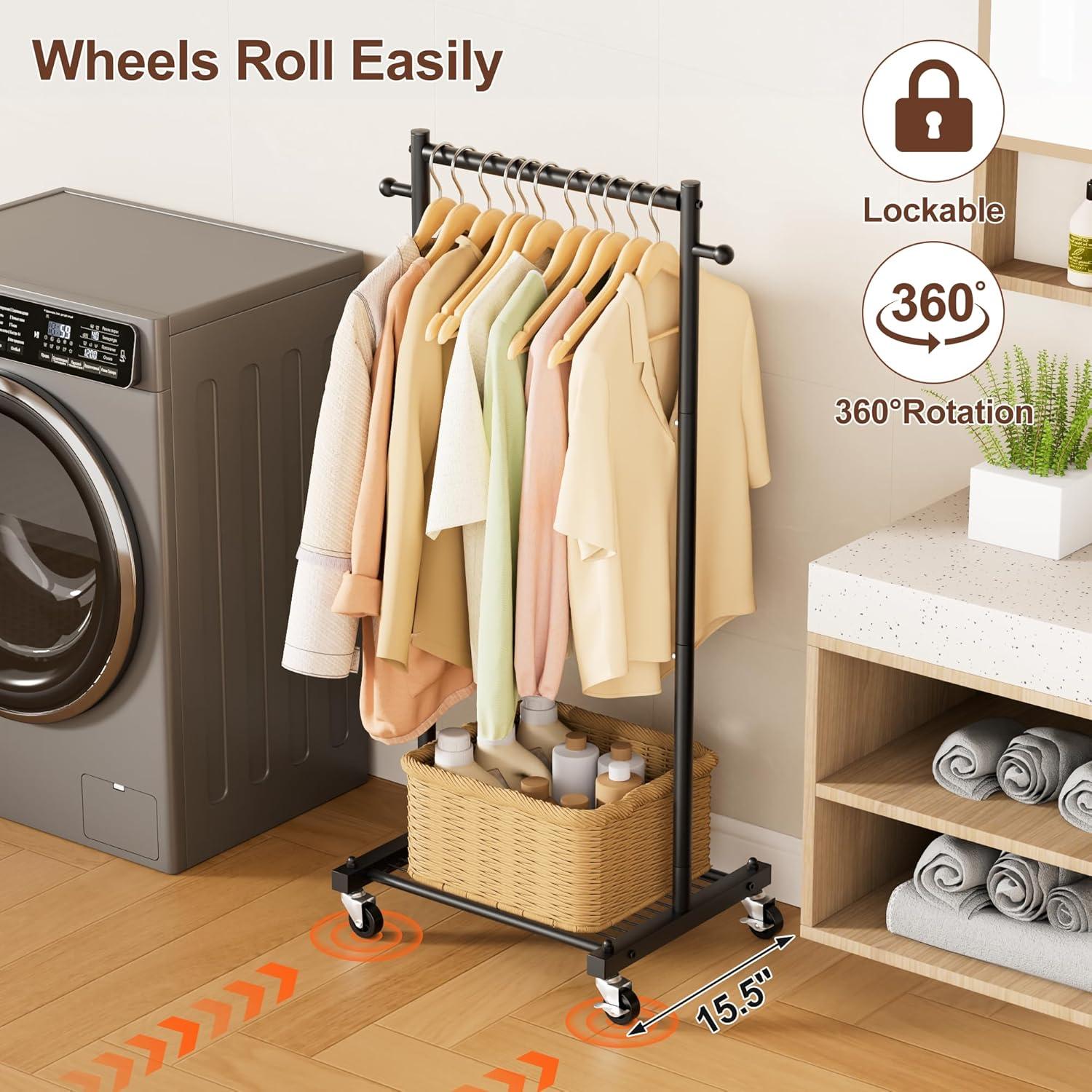 【Functional Design Details】 Smooth-rolling wheels with locks let you move and secure this stable rolling clothes rack with wheels effortlessly. The bottom frame holds shoes, side hooks handle bags and scarves, and top stoppers keep clothes from slipping, so everything stays neat