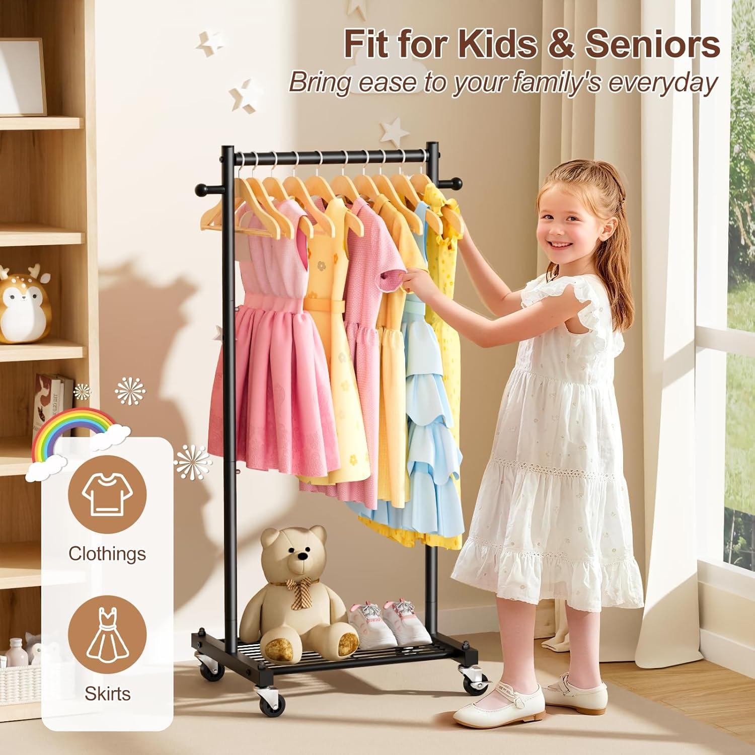 【Friendly for All Ages】 Thoughtfully designed for inclusivity, this compact kids clothing rack helps kids learn independence by hanging their own clothes. For seniors or those with mobility challenges, the lower height eliminates risky reaching. The garment racks for hanging clothes make life simpler for everyone